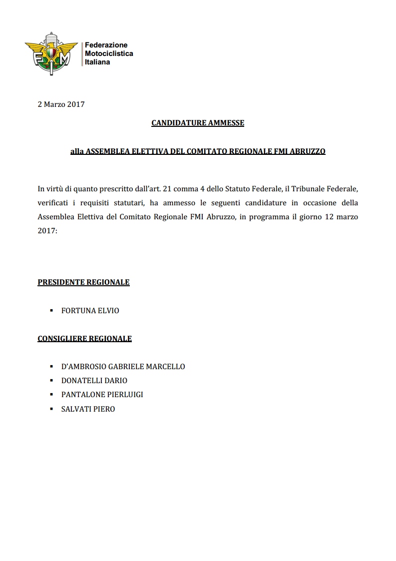 HomeComunicati » CANDIDATURE AMMESSE alla ASSEMBLEA ELETTIVA DEL COMITATO REGIONALE FMI ABRUZZO