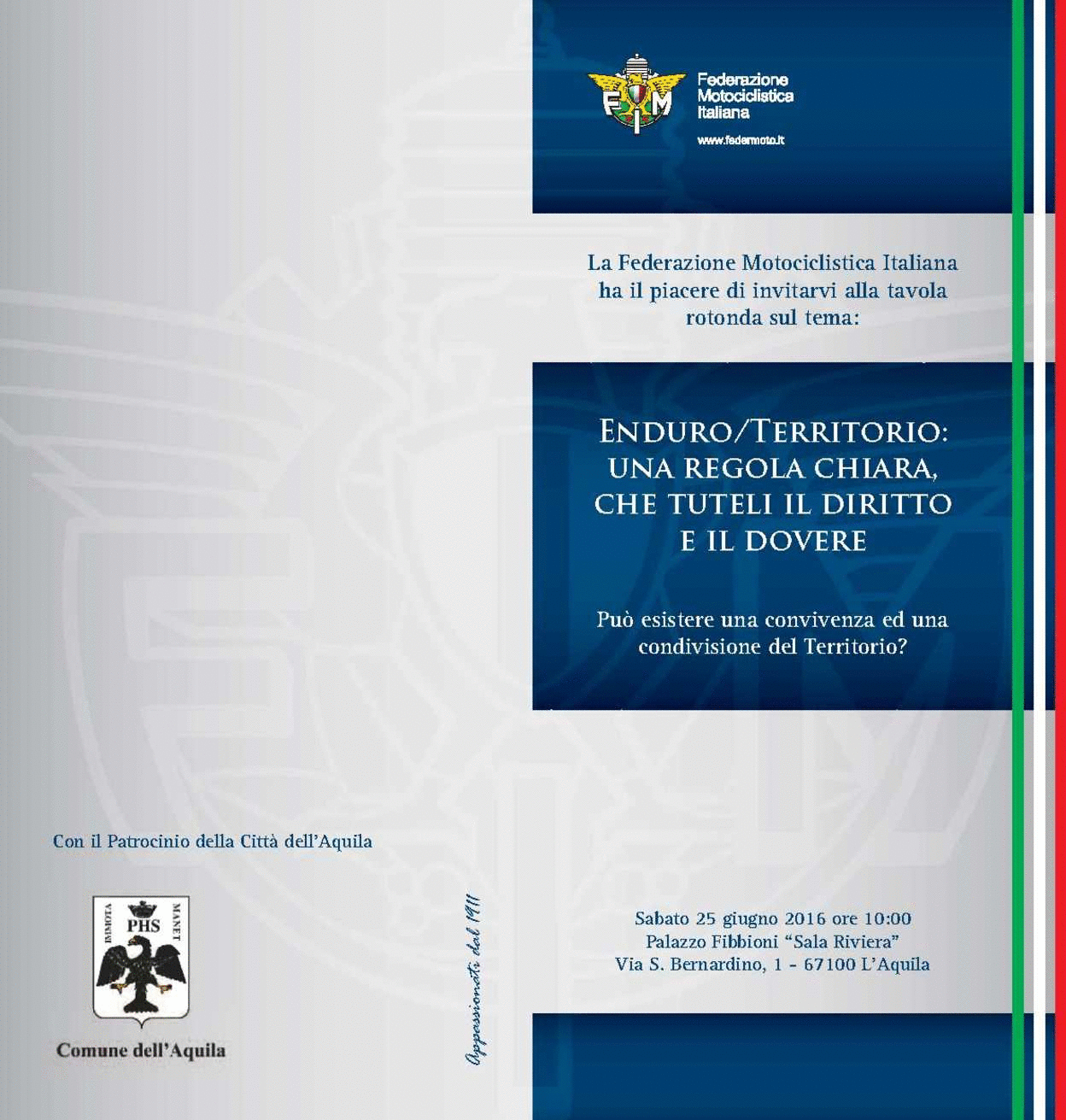L'Aquila 25 Giugno 2016 – h 10:00 Palazzo Fibboni, Via san Bernardino. La Federazione Motociclistica Italiana, con il patrocinio del Comune di L'aquila, in collaborazione con il MC Motociclisti Aquilani, nell’ottica di continuità del protocollo d’intesa con il Corpo Forestale dello Stato e con la piena volontà di promuovere una campagna informativa che sensibilizzi i praticanti dell’attività offroad sul corretto utilizzo del territorio, ha programmato una Tavola Rotonda per cercare di avvicinare il mondo dello Sport alle Istituzioni e agli Organi preposti al controllo, individuando le giuste linee guida che garantiscano il rispetto dell’ambiente e della legge ma allo stesso tempo anche il diritto di esercitare un’attività sportiva riconosciuta dal CONI. Al Convegno parteciperanno: Giovanni Copioli Vice Presidente FMI Tony Mory, responsabile politiche Istituzionali FMI, avv. Tommaso Navarra, Presidente del Parco Nazionale del Gran Sasso e Monti della Laga, Claudio D'Amico Del Comando Generale del Corpo Forestale dello Stato, i Sindaci dei territori ove si svolge prevalentemente l'attività sportiva in fuoristrada. Corrado De Luca pres. MC Sahara Project che relazionerà sulla pratica sportiva in fuoristrada in nazioni quale l'Albania e la Grecia. Il convegno è aperto a tutti Vi aspettiamo numerosi. nell'occasione si parlerà anche della istituzione del nuovo dipartimento della protezione civile della FMI, un progetto predisposto di concerto con il Ministero dell'Interno che coinvolgerà i moto club.